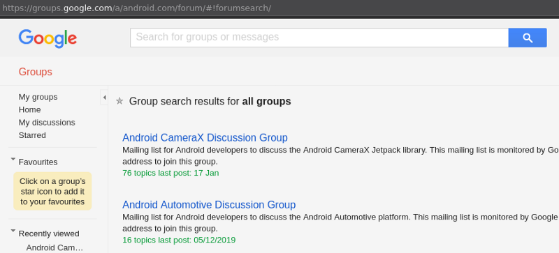 The new Groups UI completely lacks the old “forumsearch” view, so you can no longer list the public groups / mailing lists of a public domain.
